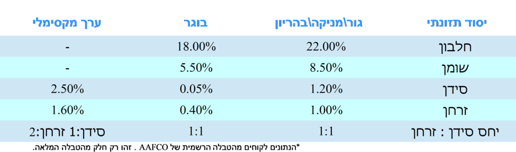 הטבלה מספקת ערכים תזונתיים מינימליים לגור ממוצע וכלב בוגר ממוצע.
